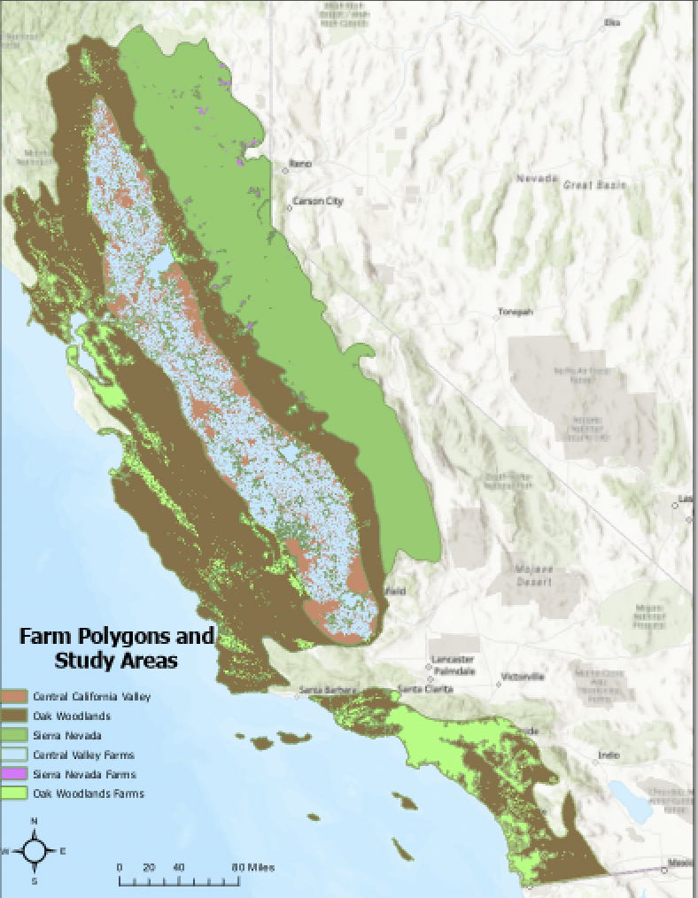 The map indicates farms in the Oak Woodland, Central Valley, and Sierra Nevada ecoregion.