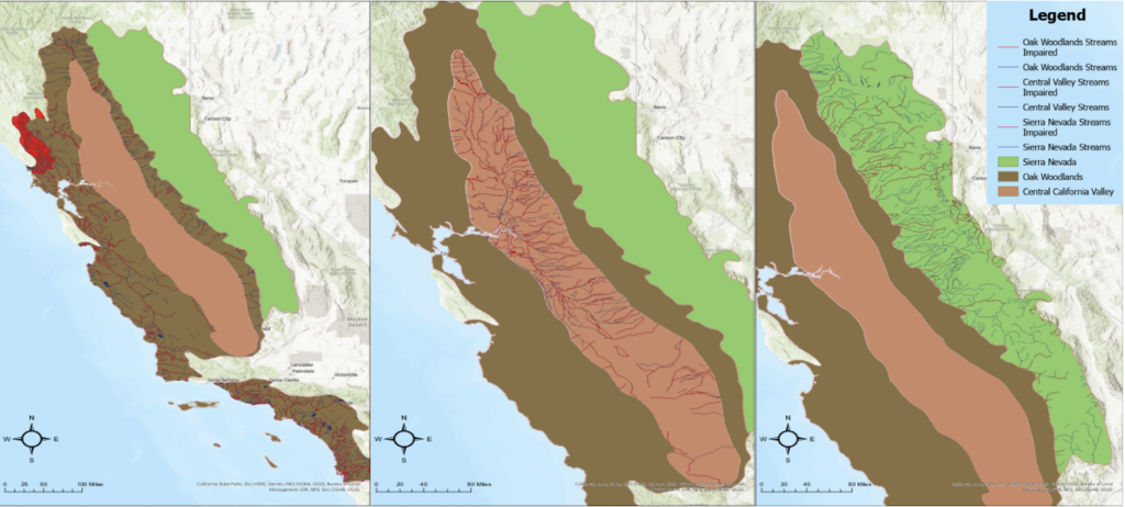 Both the Oak Woodland and Sierra Nevada ecoregions roughly contained a 70% impairment rate despite the Oak Woodland consisting of about four times the amount of farmland as that of the Central Valley.